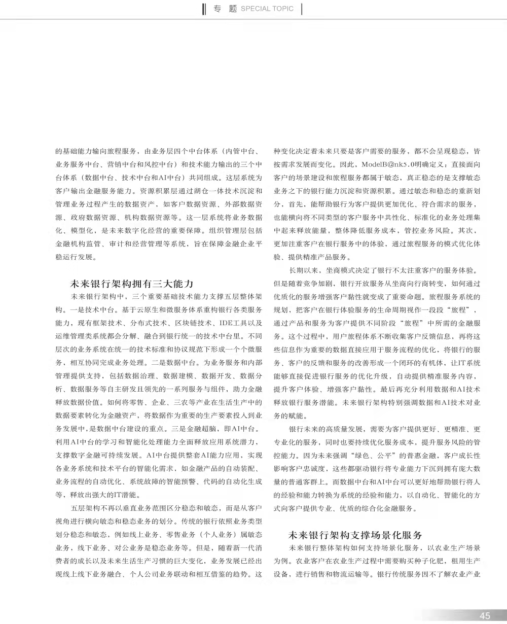 未来银行架构中,三个重要基础技术能力支撑五层整体架构。一是技术中台。基于云原生和微服务体系重构银行各类服务能力,现有框架技术、分布式技术、区块链技术、IDE工具以及运维管理类系统都会分解、融合到银行统一的技术中台里。不同层次的业务系统在统一的技术标准和协议规范下形成一个个微服务,相互协同完成业务处理。二是数据中台。为业务服务和内部管理提供支持,包括数据治理、数据建模、数据开发、数据分析、数据服务等自主研发且领先的一系列服务与组件,助力金融释放数据价值。如何将零售、企业、三农等产业在生活生产中的数据要素转化为金融资产,将数据作为重要的生产要素投入到业务发展中,是数据中台建设的重点。三是金融超脑,即AI中台。利用AI中台的学习和智能化处理能力全面释放应用系统潜力,支撑数字金融可持续发展。AI中台提供整套AI能力应用,实现各业务系统和技术平台的智能化需求,如金融产品的自动装配、业务流程的自动优化、系统故障的智能预警、代码的自动化生成等,释放出强大的IT潜能。