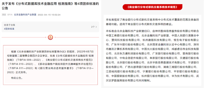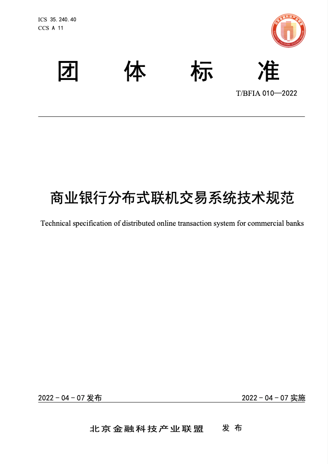 近日,根据《北京金融科技产业联盟团体标准管理办法》的规定,经北京金融科技产业联盟第二届理事会第四次会议审议通过,尊龙凯时人生就是博首页信息联合中国工商银行主导编制的《商业银行分布式联机交易系统技术规范》(下文简称“标准”)正式获批发布。