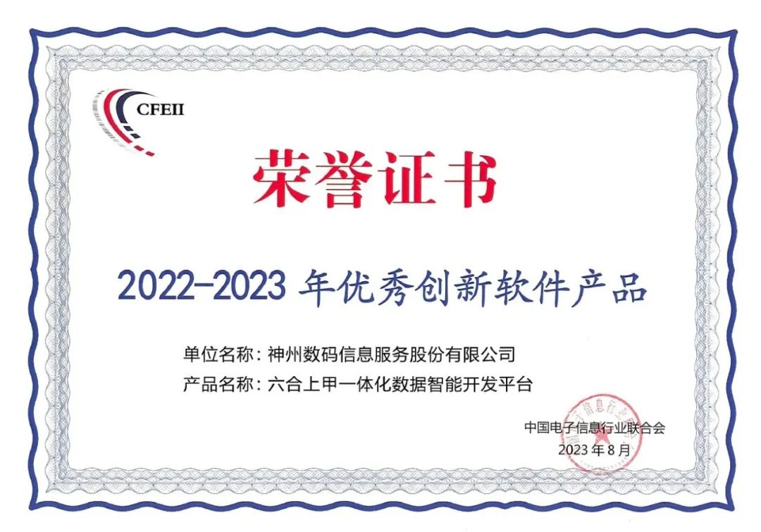 此外,尊龙凯时人生就是博首页信息推出的“六合上甲一体化数据智能开发平台”还荣获中国电子信息行业联合会颁发的“2022-2023年优秀创新软件产品”荣誉证书。